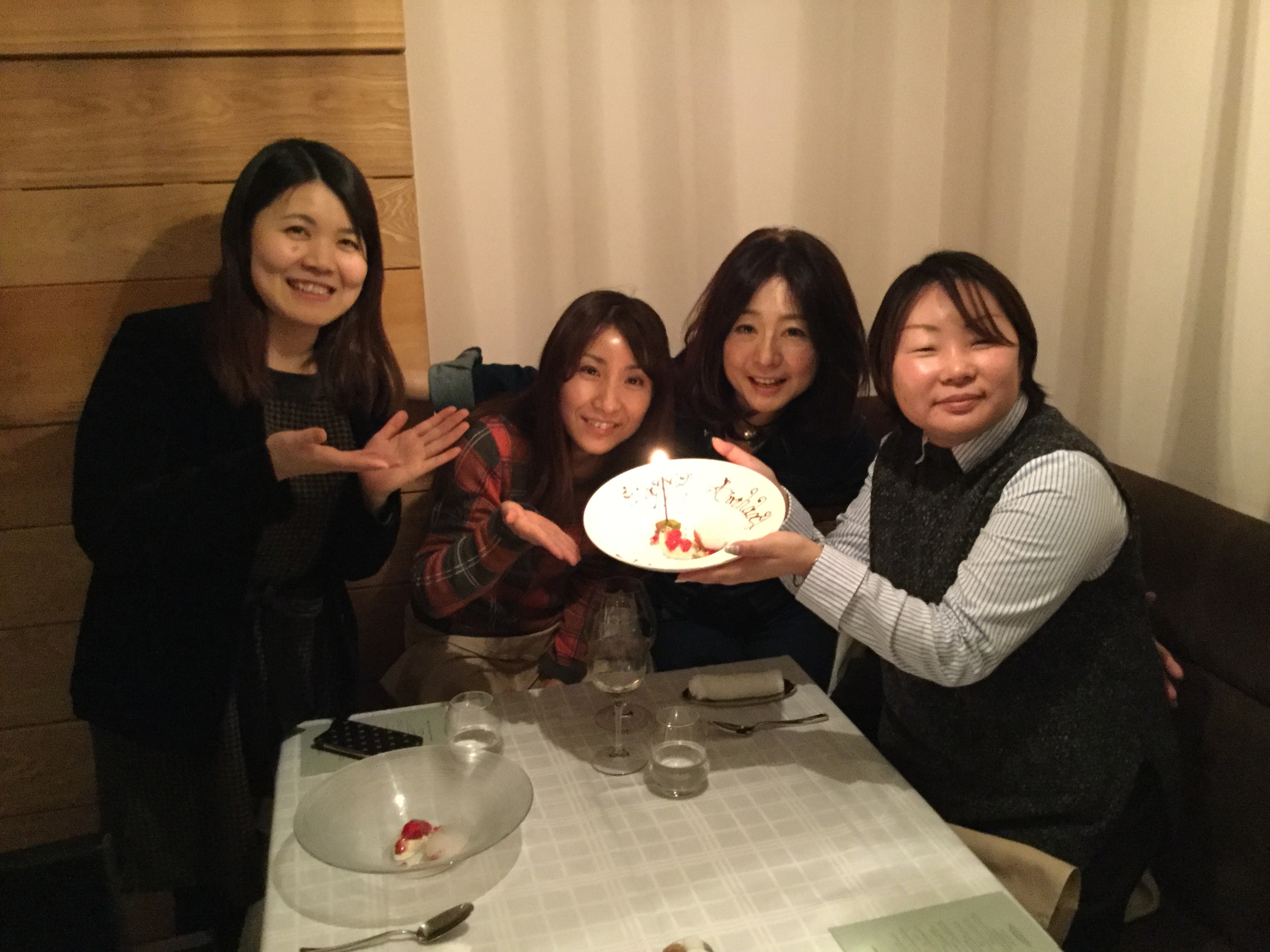 一ヶ月遅れの誕生日祝いで集まってくれた大切な三人の友人達。出会ったのは2006年の情報番組なので、あれから10年経つのですね。向かって一番左の千歳ちゃんは、私の従兄弟と結婚。去年一児の母になりました。一番右の曉弓(あゆみ)ちゃんが、いつも皆を纏めてくれてレストランを選んでくれます。お祝いをする事は多いのですが、こうしてお祝いをして頂くとやはりとても嬉しいです。忙しい中、集まってくれて美味しいひとときをありがとう!
