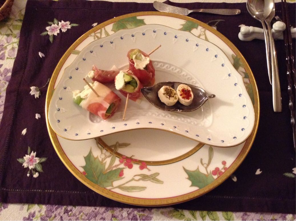 久しぶりに我が家で友人とディナーを共にしました。ここ数年は近くのレストランでご一緒した後、デザートワインは我が家でというケースが多くなりましたが、今宵は久しぶりにアペリティフから準備しました。学生時代からの友人、洋子さんのお誕生日2月2日のお祝いも兼ねて、お招きしました。チーズが好きな彼女に併せたアペタイザー、生ハムとスライスチーズとアボカドをクルリと巻いてみました。右の小さな小皿に載ったチーズは、成城石井で見つけた「タルタル・アペリフレ」を使ってみました。