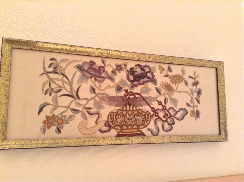 こちらは階段の脇にセットで飾っている帯を額装したものの一つ。曾祖母の形見で、色が綺麗なのでテーブルセンターとして飾っていたもの。少し汚れてきたのでクリーニング後、LOFTの額装コーナーにお願いして作ってみました。