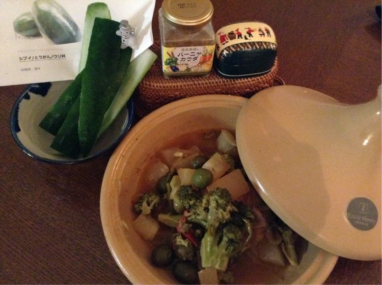 沖縄の友人から頂いた野菜「シブイ」を使って、タジン鍋をしてみました。スイカのような皮は、野菜ジュースにして頂きました!塩麹を入れても美味しいですが、バーニャカウダ風味と良く合いました。