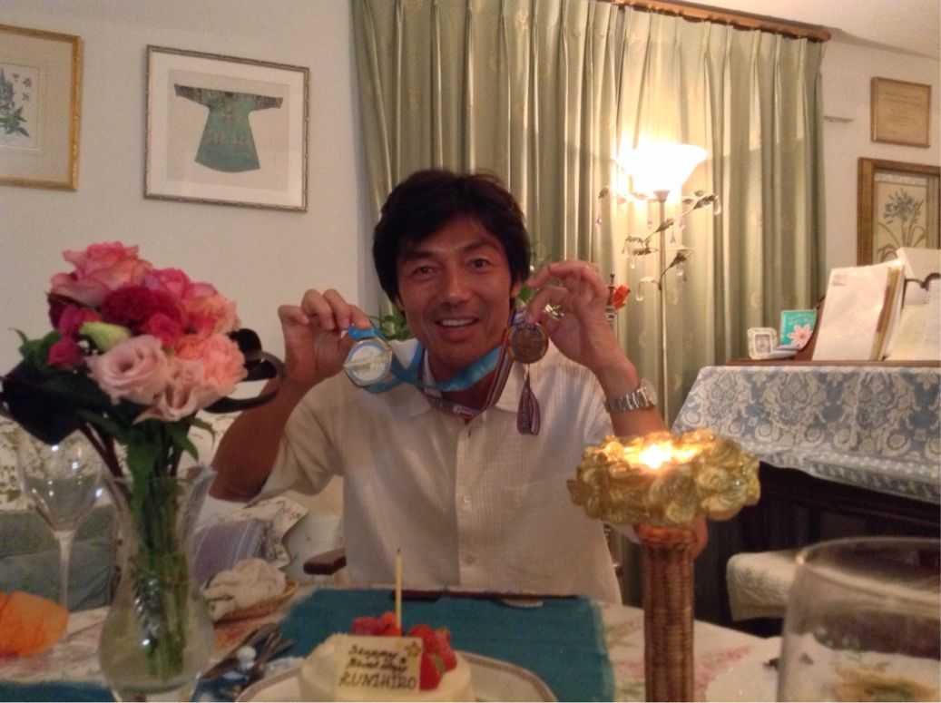 This is my friend,Hiroshi Isobe.He is a narrator,and an actor,and an athlete!He participated in long distance races this year including Saloma lake 100kilos marathon,Osaka marathon,Kyoto marathon etc.He wears this year's marathon commemorative medals.
