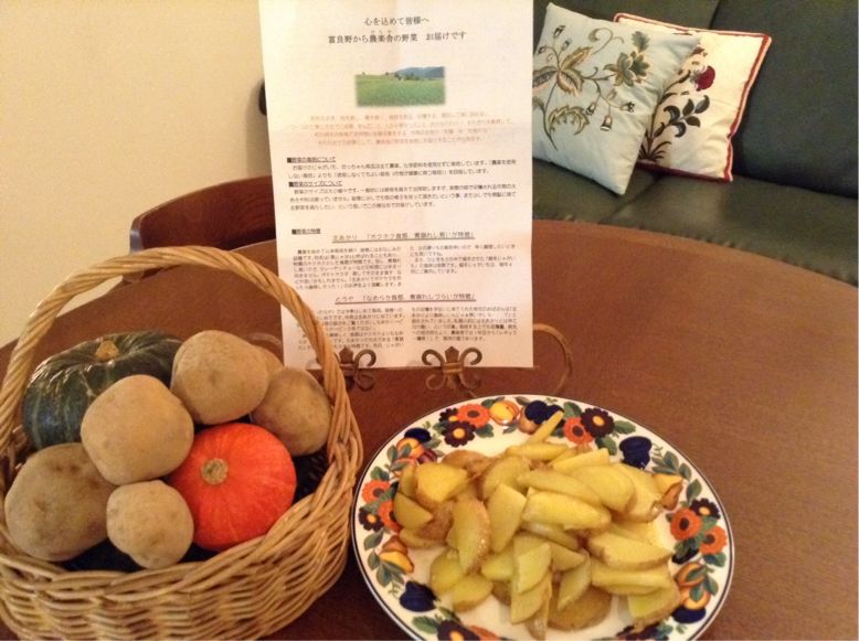 北海道に農業をする為に移住した従兄弟から冬野菜が届きました。大学を卒業して自然食品のお店に勤め始め、奥さんと出会い、富良野に移住。2000年に独立して自分の畑を耕しながら、身体に優しい穀物、野菜を作っています。皮付きのままスライスして、軽く茹で、オリーブオイルで炒め、塩、胡椒しただけの「北あかり」。ご近所にお裾分けしようと思いながら、あっという間に20個程のジャガイモ、三回ほどで頂いちゃいました!