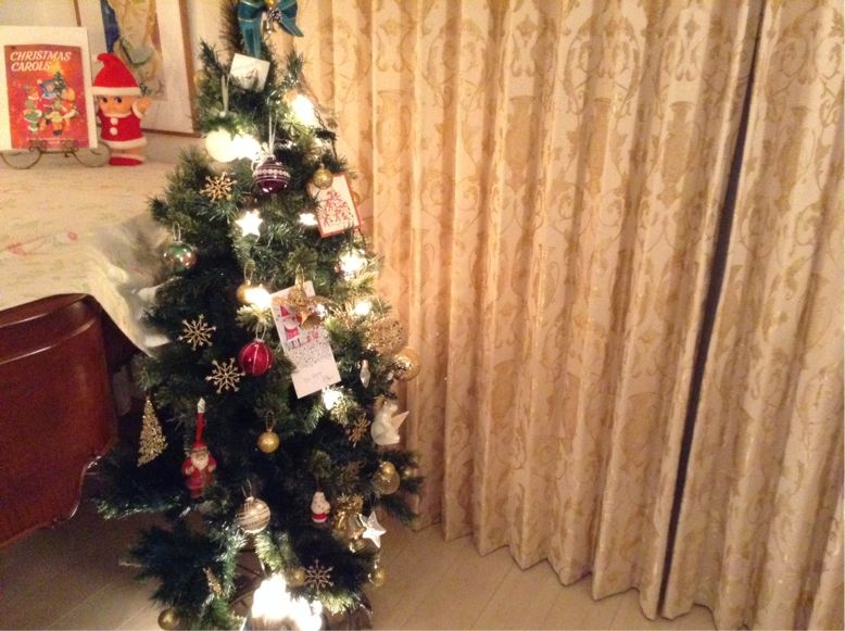 毎年少し早目にツリーを飾ります。今年はローラ・アシュレーで見付けた、貝殻のライトをツリーの根元に置いて、下からも照らしてみました。ピアノの上のクリスマスキャロルの楽譜は、小さい頃に妹と一緒に歌っていたもの。懐かしいです…