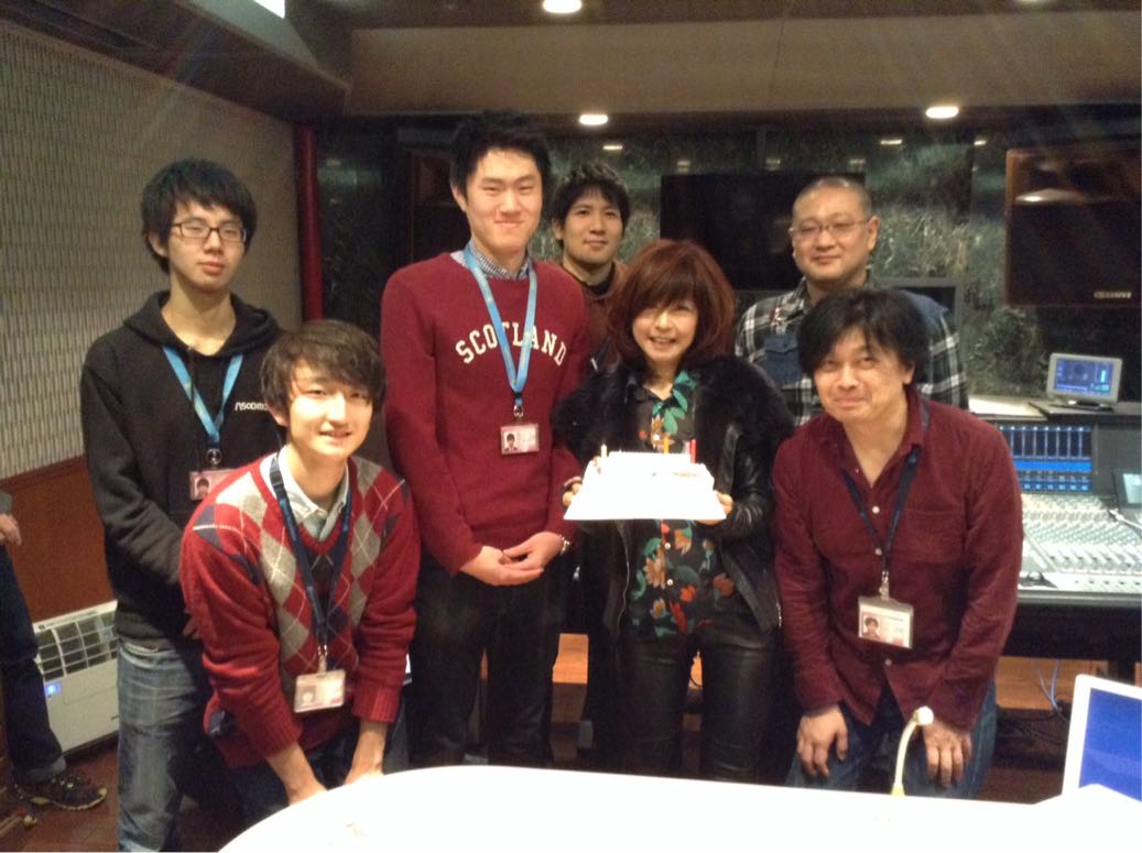 オンエア後のナレーションスタジオで、スタッフの皆さんがケーキと共にお祝いしてくれました。向かって左横、そして左後ろはアルバイトの学生、三浦誉生(しげき)さんと杉本祥一さん。右後ろの眼鏡の方は、MAミクサーチーフの深沢一友さん。またスタジオまでお花を持っていらして下さった、濱潤プロデューサーと丸山薫ディレクター! ナレーションでご一緒している、俳優の石井正則さんからも素敵なプレゼントを頂きました。皆さま大変忙しい中、ありがとうございました!