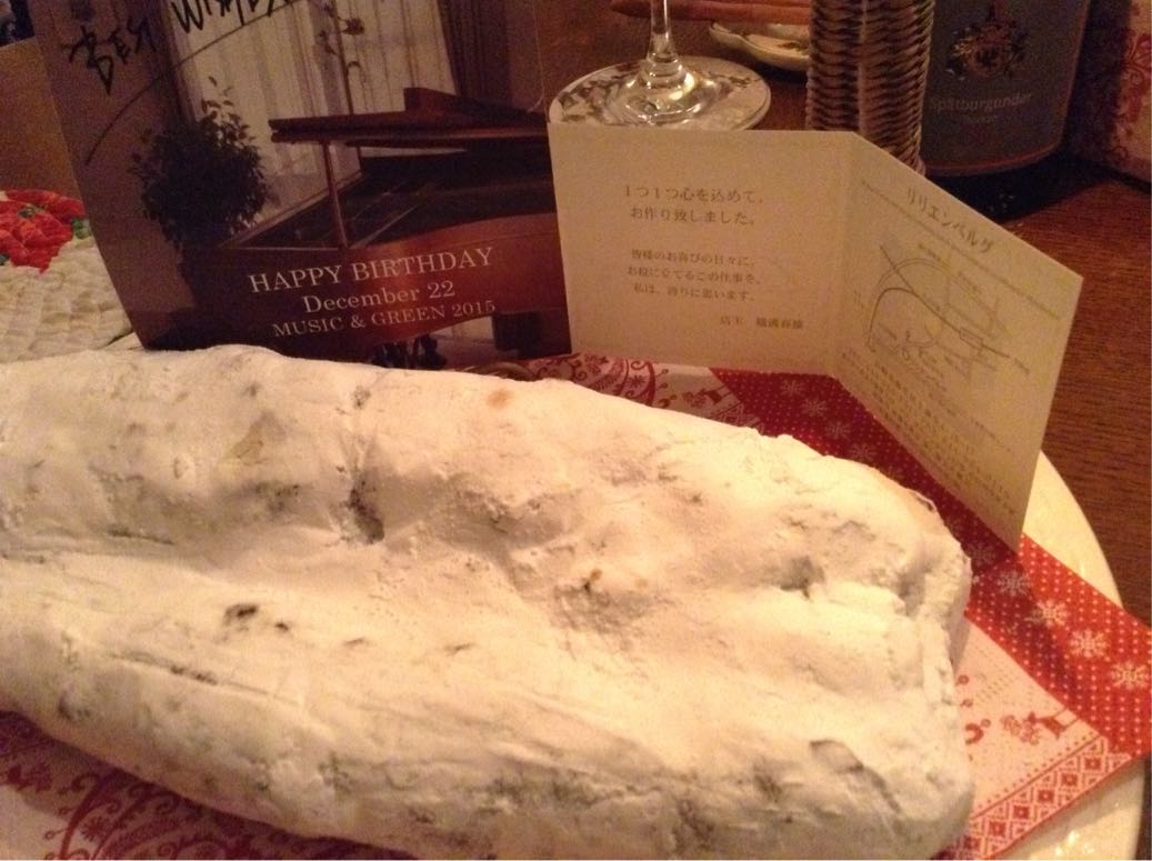 今日は1年で1番、我が家が愛に満たされる1日かもしれません。その感謝の想いはクリスマスの朝に託す事にして、今日は1番お世話になっている二人の大切な人からもらったプレゼントを写してみました。亡き母の妹、育ての母でもある徳弘佐和子叔母から今朝届いたシュトレーン。クッキー好きの私が一番好きなウイーン菓子工房「リリエンベルグ」の一品。砂糖漬けのシュトレーンは特に好物ではなかったのですが、DJ トムセン陽子ちゃんのお父様が作る大阪・枚方市「ホルガー」のシュトレーンを数年前に頂き、初めてシュトレーンを美味しいと思うようになりました。それ以来の美味しさ!でした。ドイツのピノ・ノワールといわれる「フライヤー・ファン・ゴラー・シュベートブルグンダー2012」と共に頂き、良く合いました。バックに映るカードは、今朝ツリーのトップに飾ってありました。夫の修が、家のグランドピアノをバックに録った写真をベースに作ってくれた一枚。そしてリリエンベルグのお菓子に、必ず付いてくるカードの言葉に毎回涙腺が滲みます。「皆様のお喜びの日々に、お役に立てるこの仕事を、私は、誇りに思います。店主 横溝春雄」。 私も心から誇りに思う仕事を生業にすべく、邁進して行きたいと改めて思った今宵でした。
