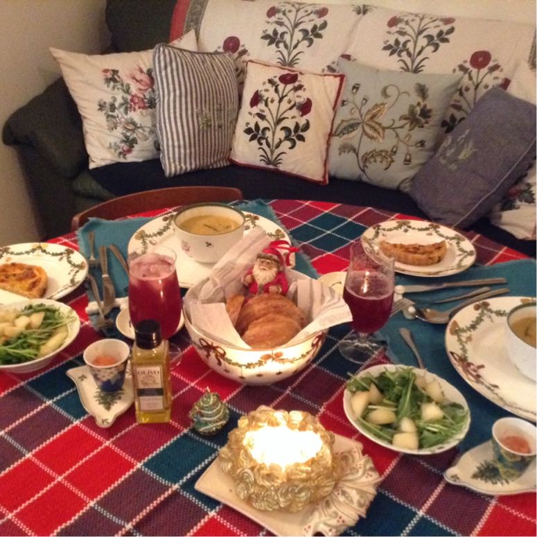 今年も沢山の心温まるプレゼントをお贈り頂き、ありがとうございます。先程皆さんへのお礼のハガキを出しに郵便局に行ったら、またまた沢山の人で溢れていました。美味しいパンだけ買って、後はあるもので済ませました。テーブルクロスはMr.サンデーでご一緒している丸山薫さんからのプレゼント。それに合わせてお皿をセットしてみました。叔母から頂いたオリーブオイル"OLIVO はパンに付けてもサラダにかけても美味しくて、この冬大活躍しています!