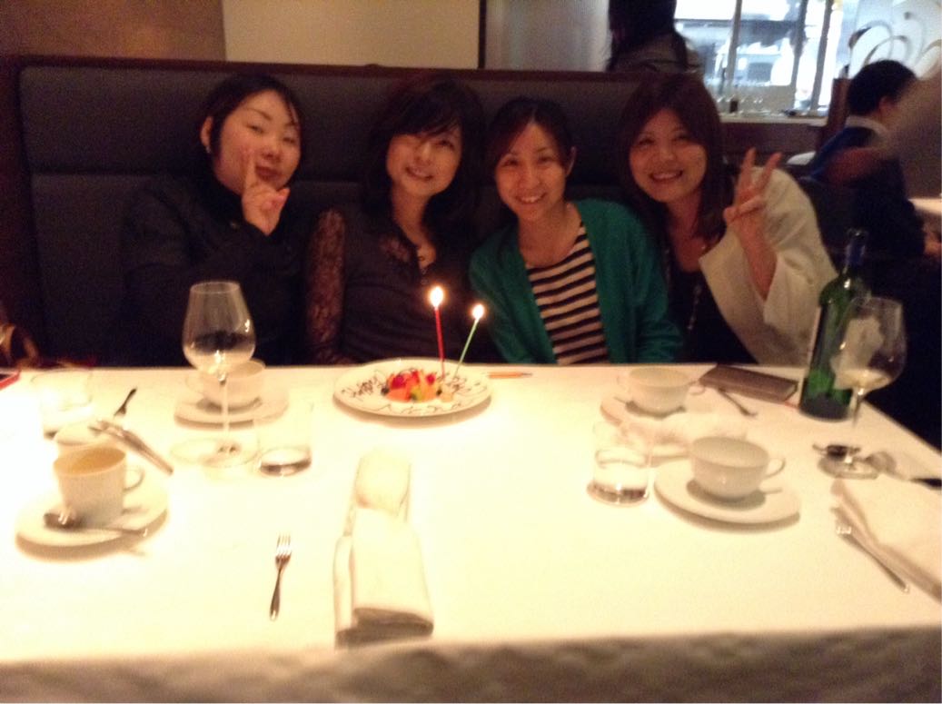 今年も一年を締め括るひと時、誕生日を祝ってくれた三人の大切な友人たち。2006年に仕事でご一緒して以来、気が付いたらもう8年。今年一番右側の千歳さんは、私の義理の従姉妹となりました。一番左側がいつもリードして、会を開いてくれる暁弓さん。いつも細やかな心配りをありがとう。そして「今年はいろんな勉強した一年でした。」と、いつも真っ直ぐな生き方が可愛い直子さん。今年も徹夜明けで駆け付けてくれました。来年からは私がみんなを招かせてね!もう年を取らないから!と約束したところですが、忙しい三人が心を合わせて、素晴らしいひと時を作ってくれたこと、何よりの宝物です。
