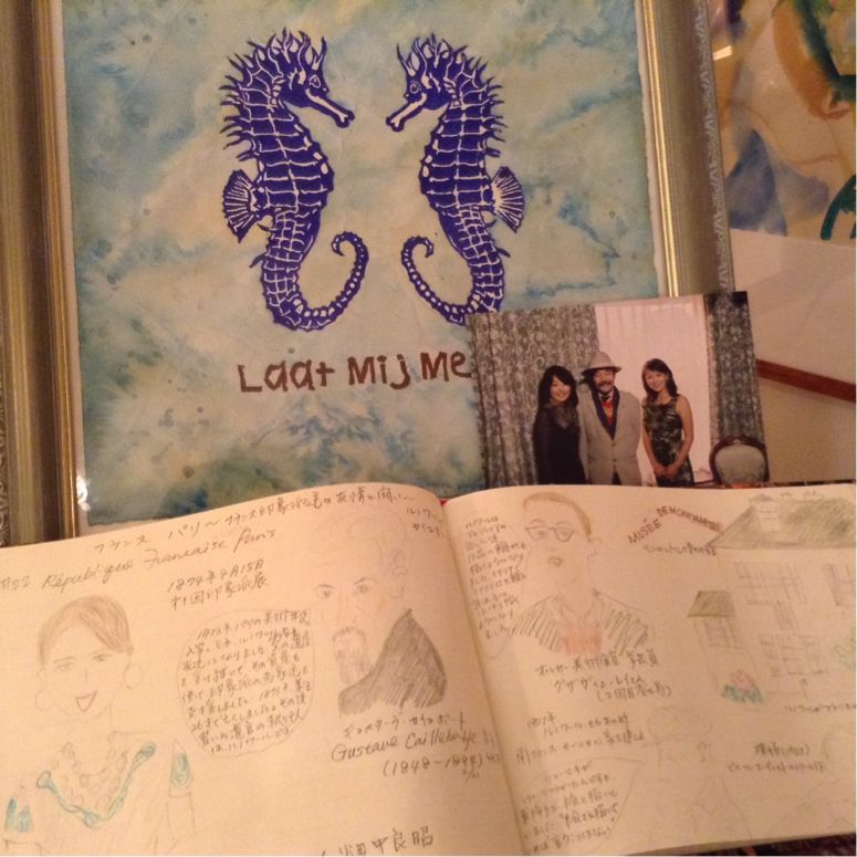 テレビ東京・佐藤哲也プロデューサーに抜擢して頂き、2010年からナレーションを担当させて頂いた思い出深い番組です。ナレーションを担当して、視聴者の方々から感想やお葉書、メールを沢山頂いたのは、この番組が初めてでした。絵画は勿論、毎回訪ねる美術館の学芸員の方々や、街の人々、雑貨屋さん、レストランなど、いつかヨーロッパを旅する時に、情報を留めておきたかったのがきっかけで始めたスケッチ。一冊のノートになりました。奥の絵はオランダを紹介した第二回目の放送で、現地の版画家エリスさんのスタジオにあった一枚。とても気に入って、現地のコーディネーターの方を通して購入した作品。奥の写真は、佐藤プロデューサーと、番組ナビゲーターの大橋未歩アナウンサーと一緒に撮った記念の写真です。