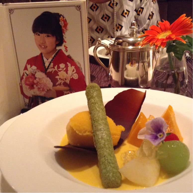 Best wishes to my best friend's daughter who came of age this month.Her name is Natsune stands for Summer's tone.This summer dessert is my favorite sweets made by splendid patissier,Sakae Saitoh of Josui Kaikan.