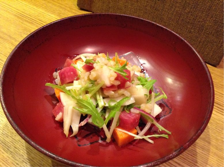 If you are living around Kyodo area,"Otaki",a Japanese restaurant is my recommendation.If you like Sake,Kokuryu from Fukui district has a fruity flavor like Sauvinhon Blanc.This is an original salad made with Genmai and Autumn vegetables.