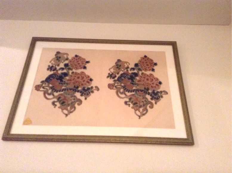 こちらは階段の脇にセットで飾っている帯を額装したものの一つ。曾祖母の形見で、色が綺麗なのでテーブルセンターとして飾っていたもの。少し汚れてきたのでクリーニング後、LOFTの額装コーナーにお願いして作ってみました。