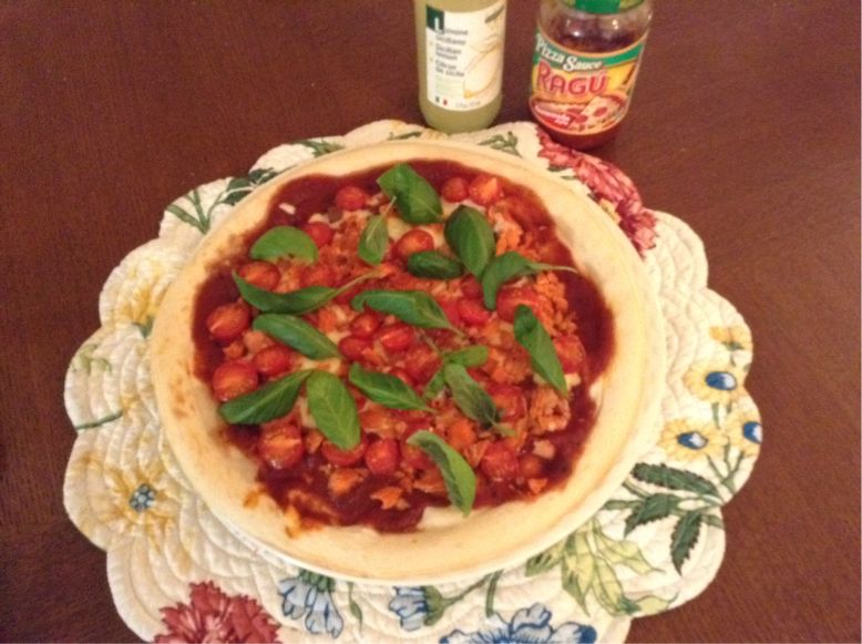 Brush the crust with olive oil and spread the Ragu pizza sauce over the crust.Sprinkle sliced Autumn salmon,cheese,mini tomatoes.Place in oven toaster for about 18minutes.Sprinkle basil over the top and enjoy!
