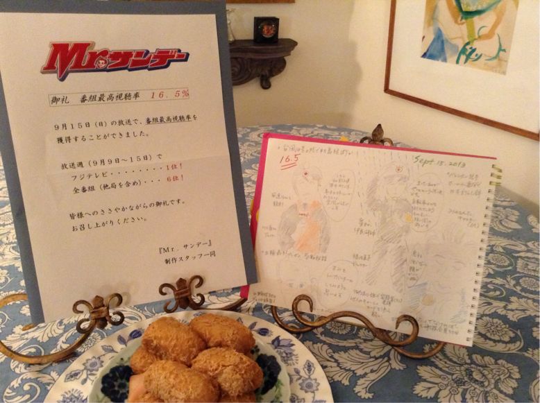 今日一番嬉しかったのが、番組プロデューサーの熊田辰男さんから渡された、番組最高視聴率のお知らせと「おつな寿司」のおいなりさん!毎回スタジオに入ると、まず視聴率を伺うのですが、今夜は目頭が熱くなりました。日曜日の夜10時から、沢山の方々が楽しみにして下さっている「Mrサンデー」に関わる事が出来たこと、心から感謝した夜でした。