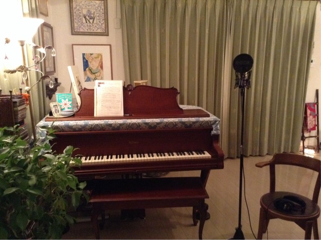 その微妙なニュアンスを伝えつつ、且つピッチを外さないよう注意しながら歌うのが大変。そこで、音を取りながら歌えるように、ピアノの前にマイクを置いて録ってみました。