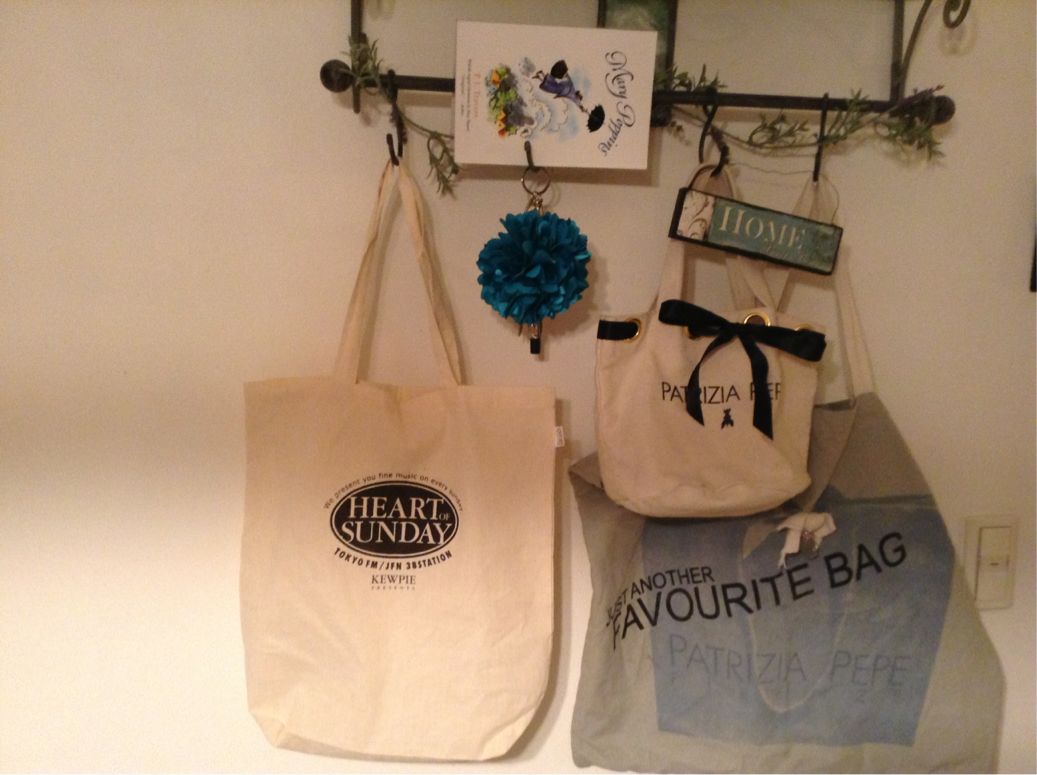 日頃使っているエコバッグです。右の二つはイタリアのブランド「パトリツィア・ペペ」のノベルティーバッグ。左のバッグは「キューピー・ハートオブサンデー」のオリジナルエコバッグです。今月から、半蔵門のスタジオに向かう日はストップウォッチやCD、選曲表などを入れて持ち歩いています。丁度A4サイズの原稿が綺麗に入ります。番組ホームページから応募して頂くと、毎月50名の方に当たるプレゼントキャンペーン中です。良かったらチェックしてみて下さいね。