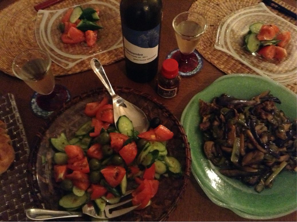 These are my favorite summer plates made by "Okinawa Glass".Red wine glasses and two glass plates and green big plate are presents from a couple lives in Okinawa.Red oil is from Ishigakijima.