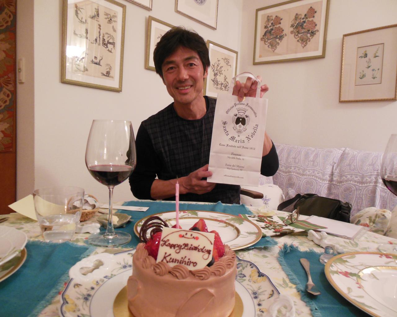 友人のナレーター磯部弘さんが我が家に遊びにきてくれました。一ヶ月程経ってしまったのですが、彼のバースデーのお祝いをしました。毎回素晴らしいワインを二本持ってきてくれるのですが(事前に宅急便で送ってくれます。)今回も美味しかったです!このケーキは三宿のラテール特製、ミルクチョコレートの生クリームで外側をコーティング、中にはたっぷりの生クリームが入っていてお勧めです。手に持っているのはおみやげで持ってきてくれたSanta Maria Novellaのローズの石鹸。(彼がナレーションを担当しているTBS『世界遺産』でも登場したFirenzeの名店です。)
