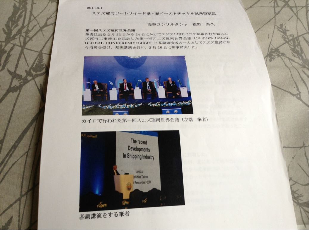 今年になって初めて実家に帰り、遅ればせながら両親に新年の挨拶が出来ました。70代に入っても以前より精力的に海運の仕事に力を入れている父。この2月に出席した第1回スエズ運河世界会議のリポートを見せてくれました。今回はスエズ運河ポートサイード港・新チャネル竣工式典に、エジプトのシェリフ・イスマイル首相等と共に出席。その時の様子をいきいきと語る父から、大いに刺激を受けました。