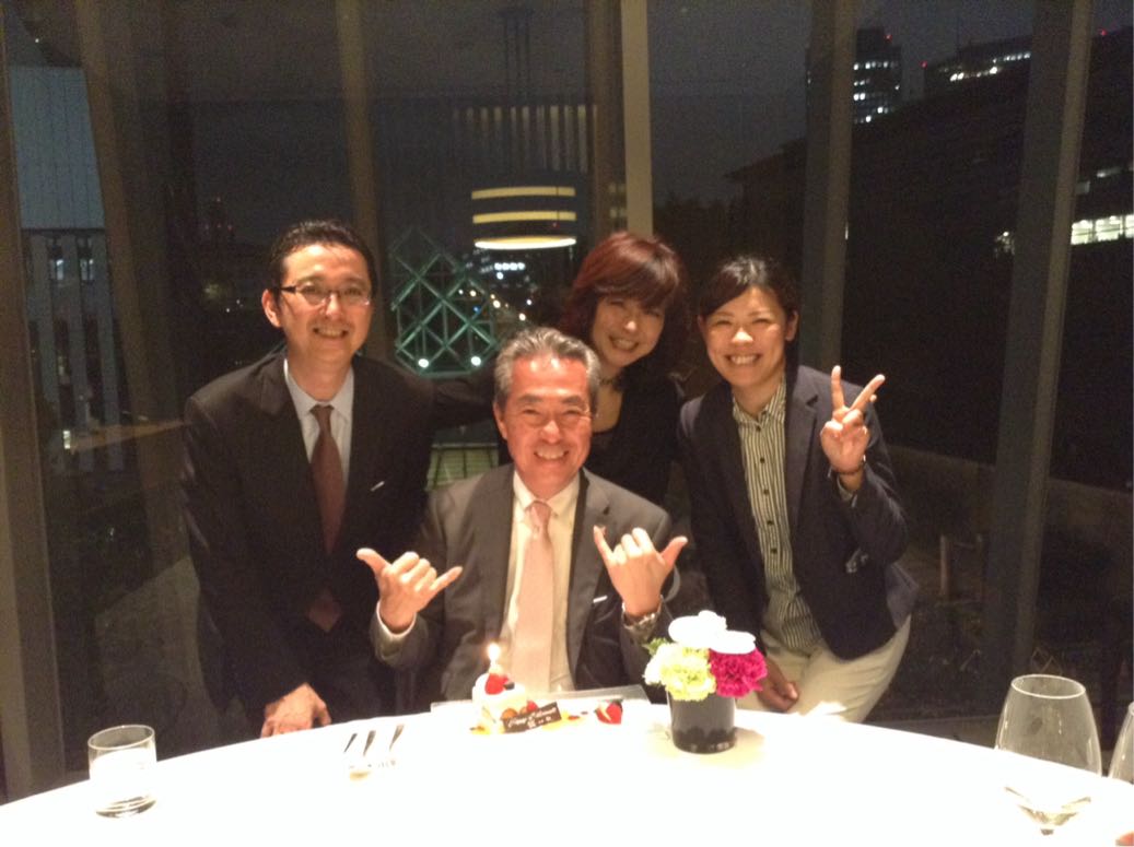We had a happy retirement party at Origami.The guest of honor is Mr Hiramoto whom I've known for 22 years through a radio program. He served 34 years as a chief of sales department for ad agency, Daiko. What I respect of him most is his heart of hospitality and his optimistic character. Whenever he comes to our recording studio, he clears the atmosphere with his sunny smiles. Also, a dinner course and wines and champagnes were very good at All Day Dining"Origami". Very grateful to origami staffs, Mr Uichiro Okubo, Mr Takashi Hirai, Mr Takashi Kasahara, Mr Yoshitaka Watanabe, and an Origami Cheff, Naoto Nakamura.