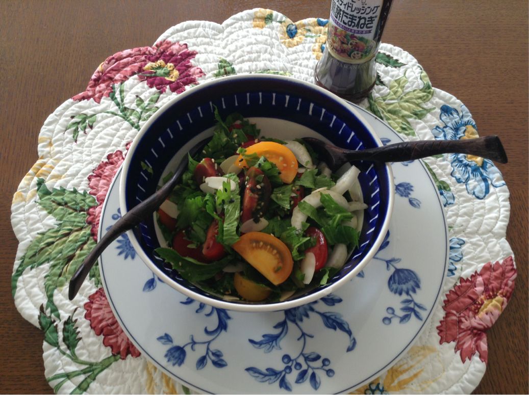 仕事帰り、夜遅くなった時に頂くサラダです。セロリとトマトのサラダ、今回は飛騨高山の有機カラフルミニトマトを使い、アーモンドスライスをトッピング。キューピーテイスティードレッシング「黒酢たまねぎ」