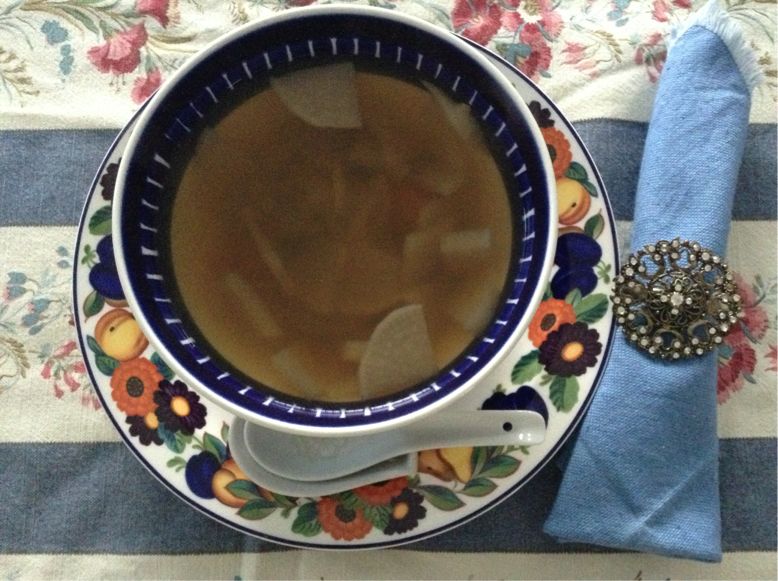 余りの暑さにクーラーは欠かせず、スタジオでも家でも、移動中の車でもクーラーの日々が続いています。夏風邪をひいて気がつきました。大分身体を冷やしていたこと!日々作っている野菜ジュースも冷蔵庫で冷やし、冷たい物ばかり飲んでいました。そんな時に作ってみたのが温かい野菜スープ。作り方は簡単です。大根、人参、ごぼう、椎茸を食べ易い大きさにカット。生姜は薄く微塵切りに。たっぷりのお湯で煮て、味付けはチキンスープと塩、胡椒のみ。セロリを入れても美味しいです。